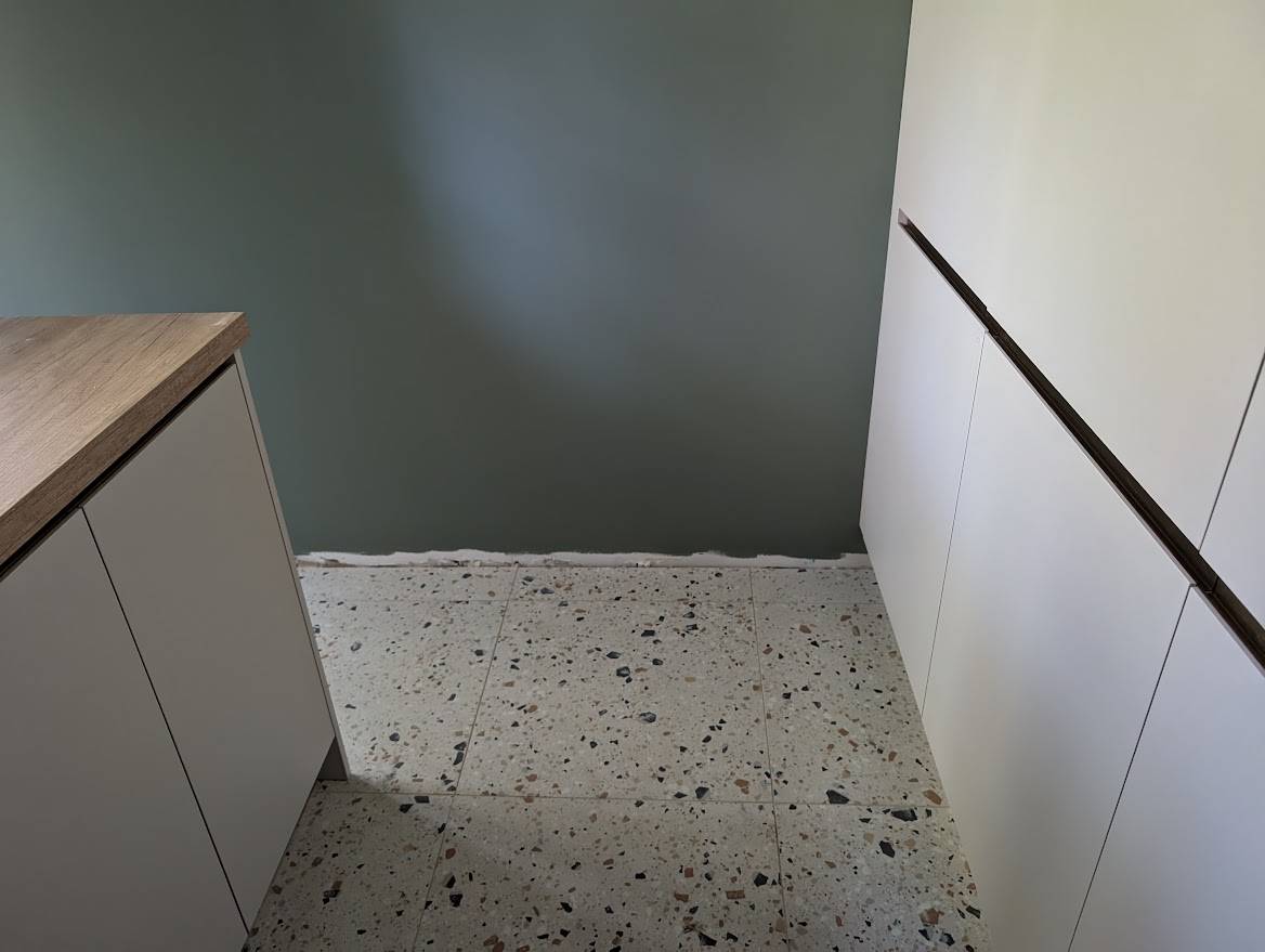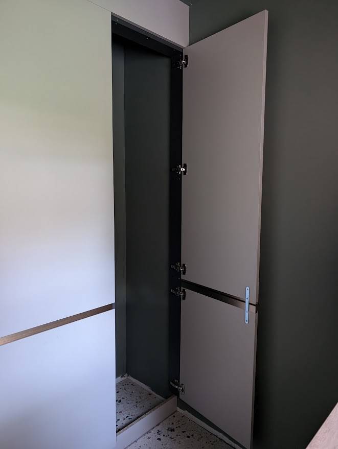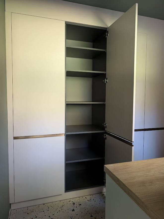 Le cellier étant assez sombre en luminosité, nous avons opté pour un coloris clair de notre gamme : le gris perle rehaussé de poignées en profil bronze (ou prise de main) pour donner de la chaleur à l'ensemble et une belle alliance avec la chaleur du ton bois pour ce cellier gris bois chaud.