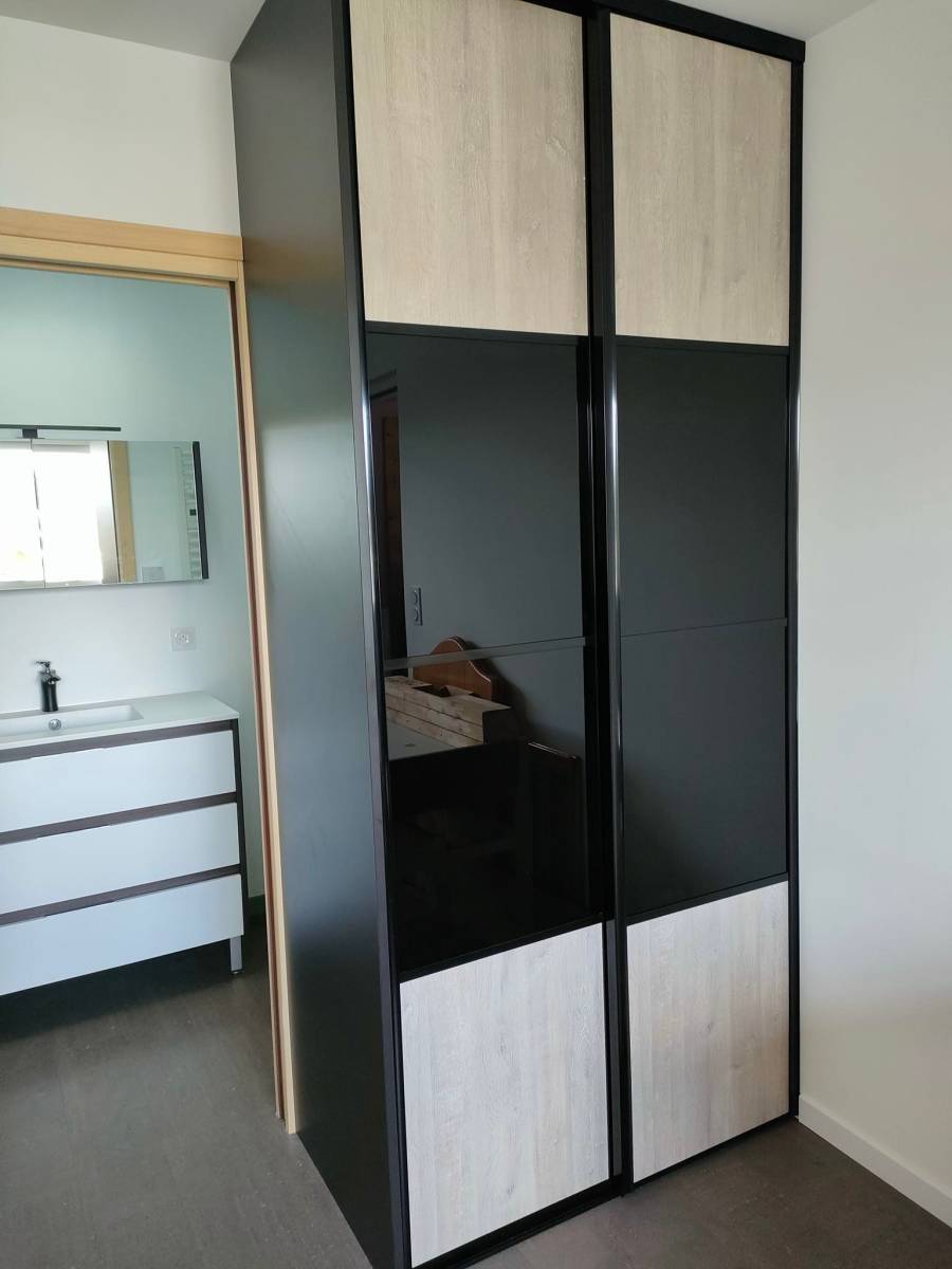 Ici, au Taillan Médoc, nos clients souhaitaient que les dressings soient la séparation avec la salle de bains se fermant grâce à une porte à galandage (porte en cloison). Nous avons sélectionné avec nos clients des portes coulissantes en 3 zones : 2 zones colori bois halifax naturel et 1 zone en verre laqué noir. Munies, d'un profil noir mat et d'un rail noir mat, nos portes sont équipées de ralentisseurs. Pour un rendu épuré, chaleureux et design, optez pour des portes de dressing toute hauteur et optimisez l'espace avec du rangement du sol au plafond.