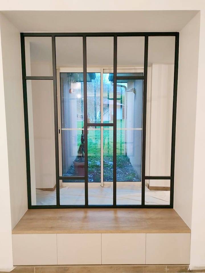 Découvrez ce projet de rénovation complète comprenant la réalisation d'une grande cuisine ouverte sur le salon composée de meubles sur-mesure et de verrières atelier noires : droite et destructurée. Les couleurs choisies pour ce projet sont le vert Fjord et le chene naturel pour les façades, la céramique Iron naturel pour le plan de travail. Grâce à de nombreux mécanismes, cette cuisine design est pratique et ergonomique : des casseroliers dans chaque meuble, de grandes poubelles doubles bacs pour faire le tri ainsi qu'un tiroir à l'anglaise. Une grande colonne à casseroliers a été intégrée pour le rangement de l'épicerie sèche, un meuble range épices bouteilles ainsi qu'un meuble range torchon près du lave vaisselle a été pensé. Le grand ilôt central de cette cuisine comprend une cave à vin intégrée côté salon, un espace repas et un espace cuisson. Notre conceptrice a également réalisé des meubles pour le salon : un buffet console à l'entrée sous la verrière et un meuble banc assise sur mesure pour le salon sous al verrière également. Le client a opté pour le colori cachemire dans le salon et des poignées noires pour rappeler le design de la cuisine : réfrigérateur Smeg, luminaires, hotte. Les meubles sont réhaussés d'un colori chaud pour le plan de travail en stratifié BIllot qui rappelle les façades chêne naturel de la cuisine.