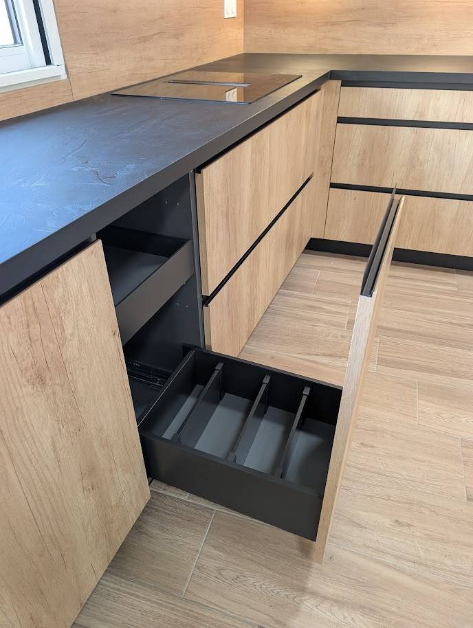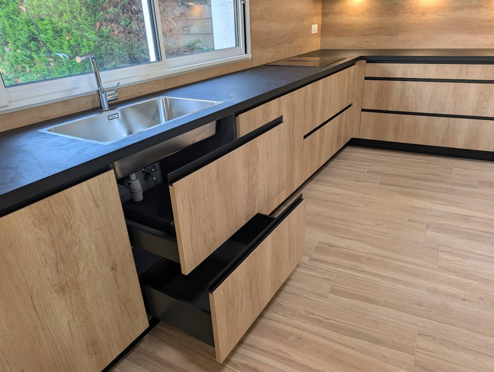 Pour ce projet, nous avons travaillé sur une base de contraste fort et de matériaux durables. La façade chêne naturel apporte une chaleur et une authenticité immédiates, créant un lien avec la nature visible à travers la fenêtre. Cette teinte est associée à un plan de travail en stratifié 39mm colori Ardoise Moon, dont la texture subtilement travaillée imite la pierre naturelle. L'ensemble est souligné par des lignes graphiques permises par la poignée profils noir mat, qui modernise le design et assure une prise en main discrète et élégante. Le résultat est une cuisine au caractère affirmé.