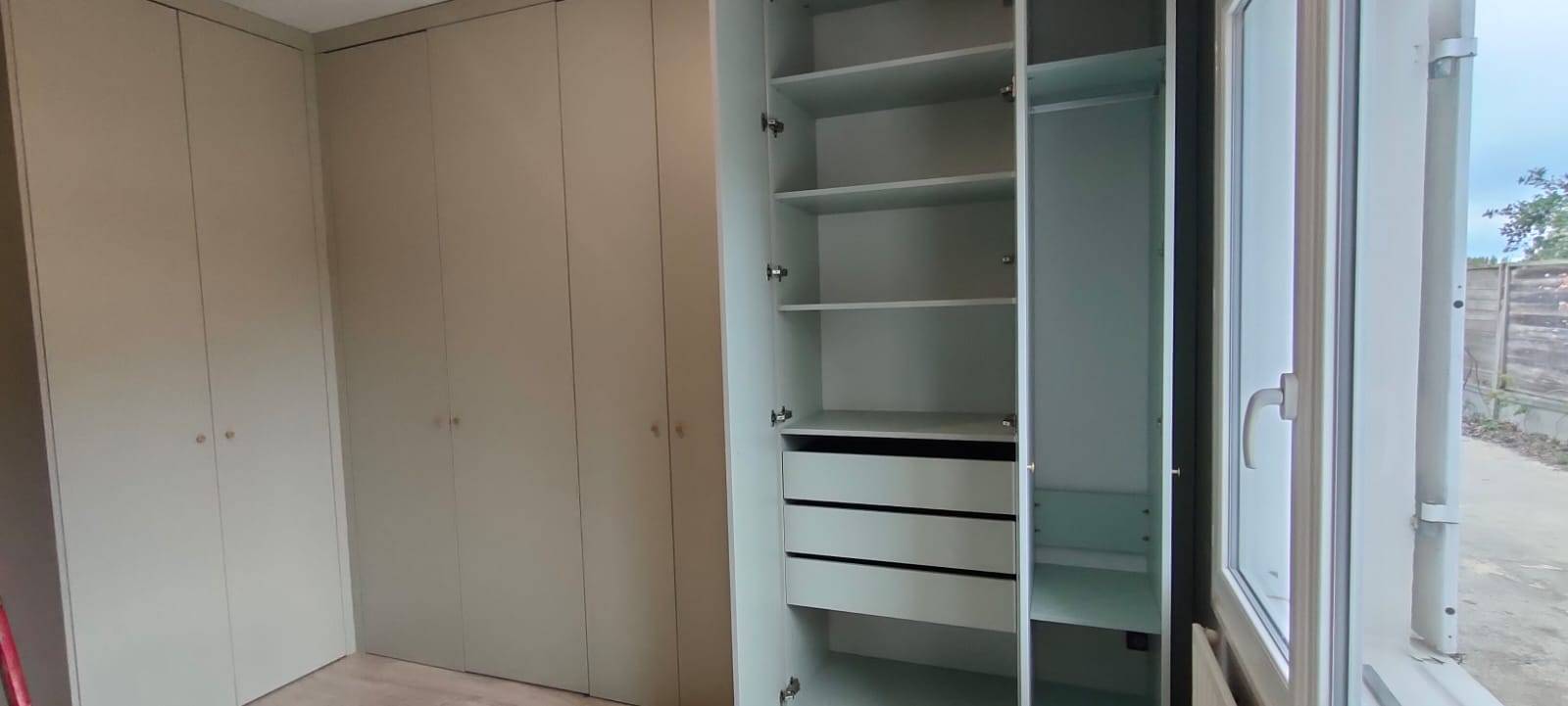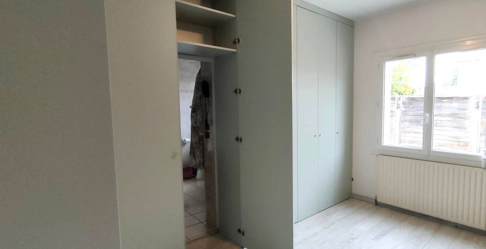 Autre challenge de ce projet, la pièce étant étroite, il n'était pas possible de créer des dressings de grande profondeur (60cm), nous avons dont réduit la profondeur en 48cm ce qui a permis d'y installer ensuite le lit. Un dressing en portes battantes donne plus de chaleur que des portes coulissantes et surtout se fond avec les murs de la pièce.