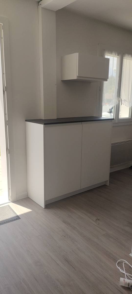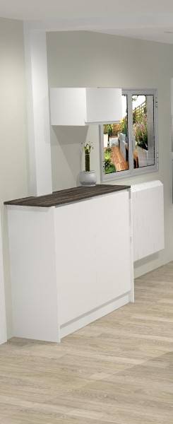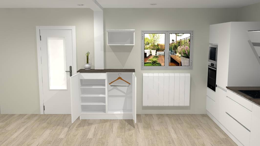 Pour finir, nous avons créé un meuble de rangement penderie et chaussures sur mesure. Un côté tiroir et étagères pour les chaussures et un côté penderie avec porte-cintres télescopique. Ce rangement permet à nos clients d'y ranger les vestes et les chaussures de la saison. Nous avons proposer notre modèle onati (prise de main intégrée) afin d'allier parfaitement avec la cuisine existante. Ce projet n'était pas sans contrainte : trouver les coloris de matériaux ressemblant pour les meubles et garder un large espace de passage donc nous avons opté pour des meubles faible profondeur. Le résultat est là, et nos clients sont ravis !