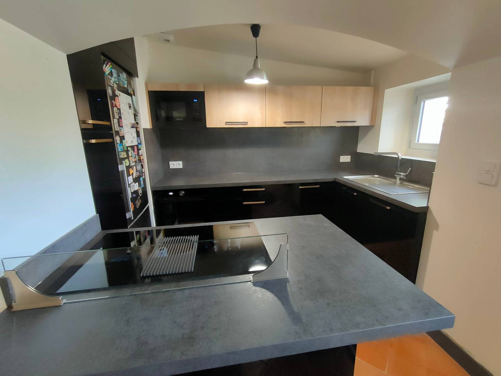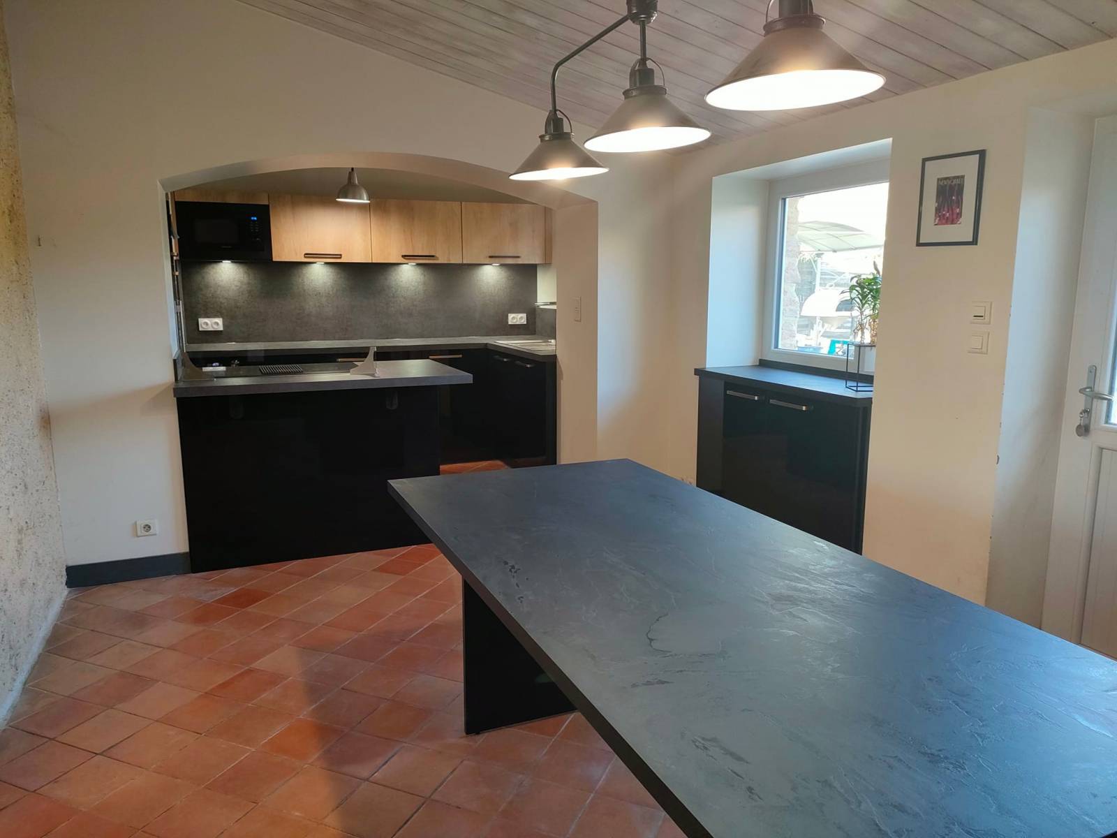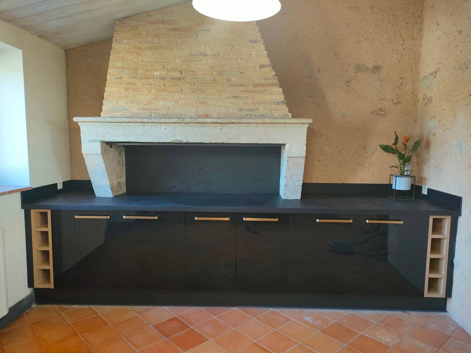 Dans le cadre d'un projet de rénovation de cuisine et salle à manger à Saint Morillon, nous avons été sollicités pour réaliser la création d'une cuisine noire et bois ainsi qu'un entourage de cheminée en rangement et une table de salle à manger. Nos clients ne souhaitaient plus se servir de la cheminée mais souhaitait l'utiliser comme rangement. Nous avons donc réalisé cette création sur mesure. Voilà un vrai projet unique et sur mesure ! Nous y avons intégré un ilôt central et une plaque induction aspirante très puissante. Découvrez l'avis de notre client :
