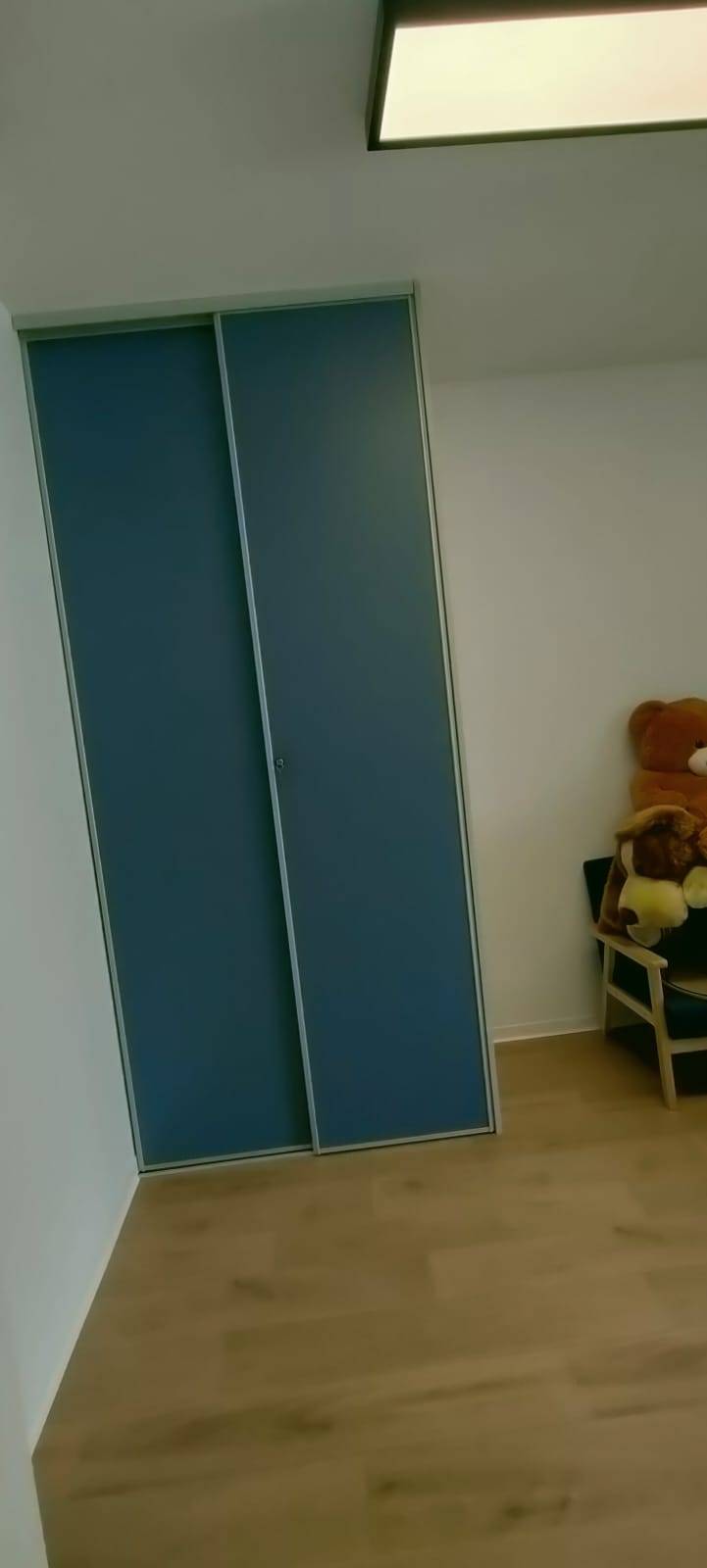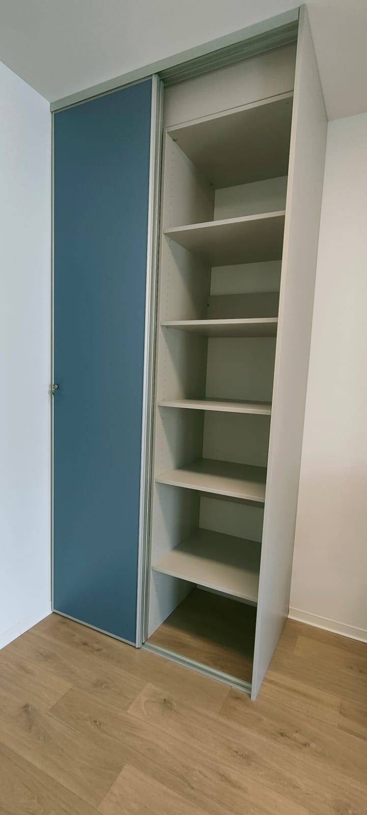 - Le premier est un placard toute hauteur en mélaminé cachemire pour l'intérieur et la joue de côté et mélaminé bleu fumé pour les portes coulissantes munies de ralentisseurs de portes. Le profil des portes qui fait office de poignées de porte coulissante est en alu brossé pour davantage d'élégance. Entièrement composé d'étagères, ce placard offre une grande capacité de rangement pour le matériel de la micro-crèche. La pièce étant petite, nous avons opté pour un placard dressing de grande hauteur pour optimiser l'espace utilisé au sol. Un rail est donc fixé au sol et au plafond (du même coloris que les profil) pour le coulissage des portes.