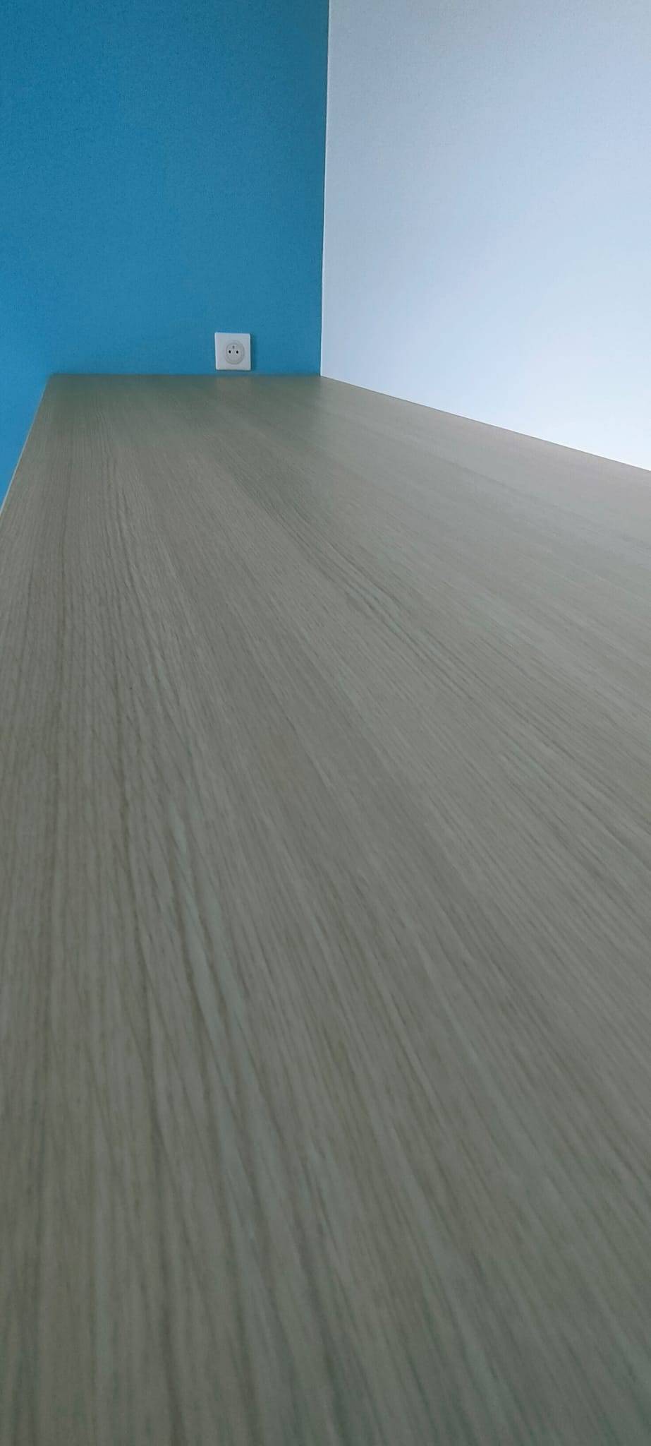 - Le second est un meuble dressing placard bas en mélaminé coloris bois chêne naturel pour l'extérieur et mélaminé nude abricot pour les portes coulissantes. Ce placard était nécessaire pour rangé les objets de motricité et de repos des enfants, nous avons donc conçu ce placard dans cet objectif. Afin de ne pas exploiter la hauteur (non disponible avec la climatisation et ne pas assombrir la pièce, nous avons opté pour un placard bas à portes coulissantes. Le plafond supérieur recouvert d'une jolie joue offre une grande capacité de rangement sur le dessus comme une belle étagère finie colori bois.