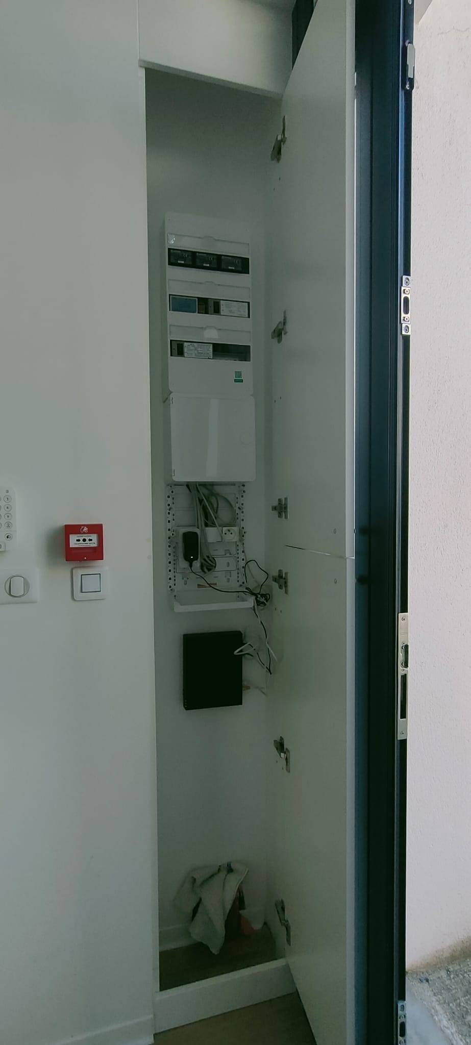 - Le troisième est un placard lui aussi sur mesure cache compteur. Plutôt que de voir un compteur électrique disgracieux, notre cliente souhaitait voir la prolongation d'un mur, c'est la raison pour laquelle nous avons opté pour ce coloris bois frêne blanc, deux petites poignées cônes discrètes et deux portes battantes. Le tout d'une petite largeur sur mesure de 42cmL. Pari gagné, le placard sur mesure se fond dans l'environnement de l'entrée de cette micro crèche.